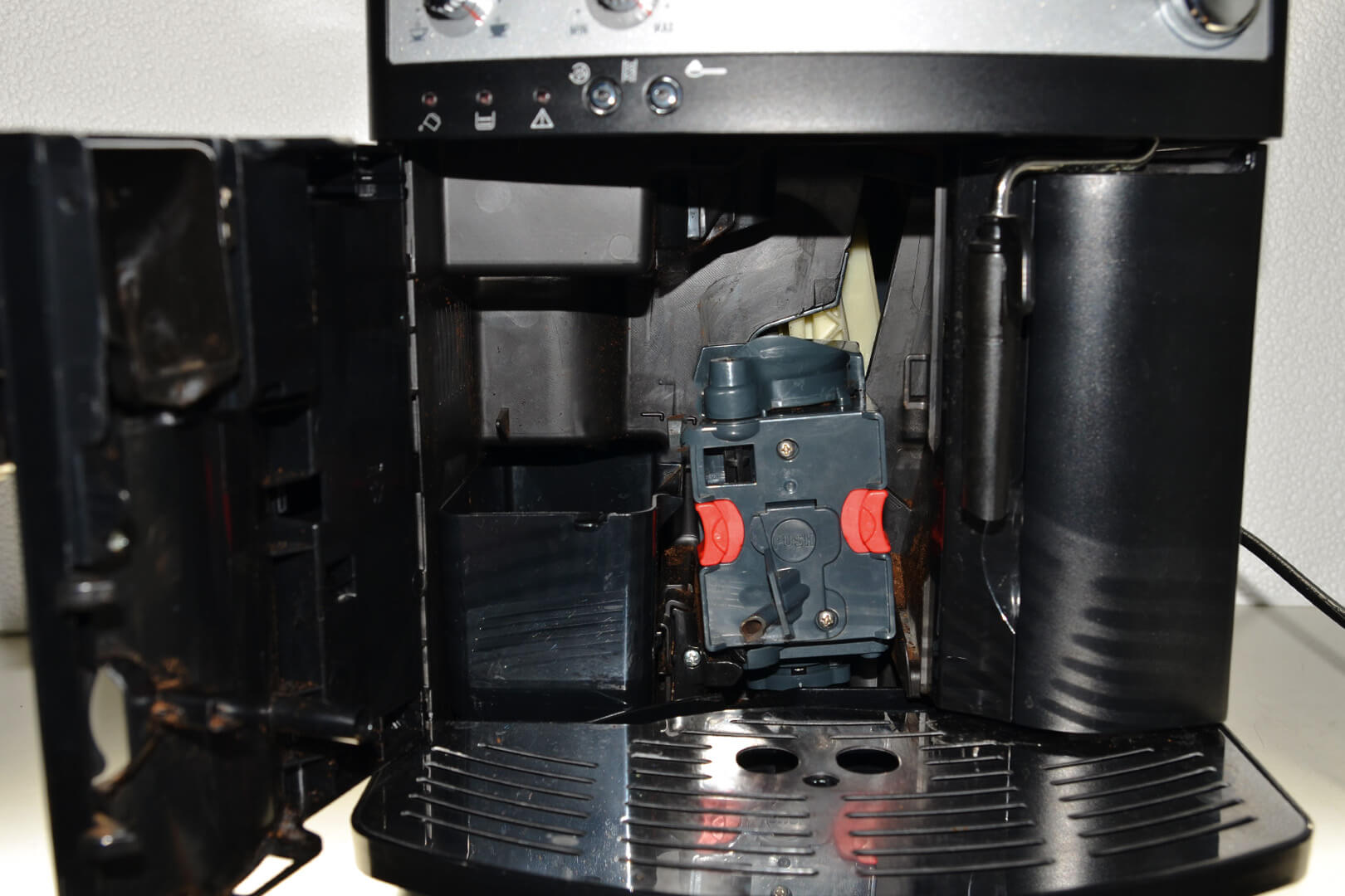 При снятии заварного механизма особое внимание уделяйте состоянию отсека, куда вставляется блок. Используйте мягкую щёточку или небольшой бытовой пылесос, чтобы удалить остатки кофе и загрязнений, скопившихся внутри корпуса.